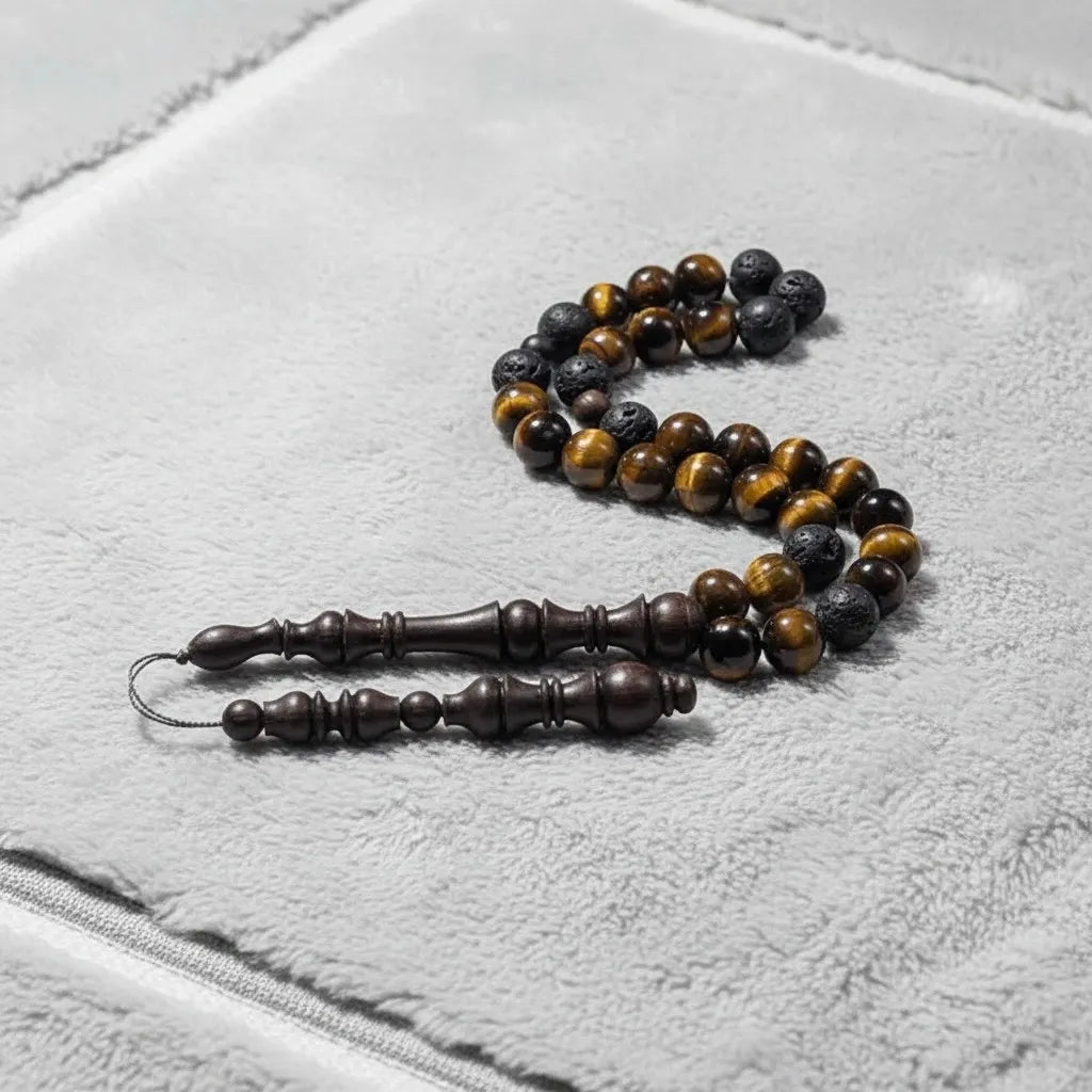 Spiritual Energy: Tiger Eye is known for courage and clarity, while Black Lava symbolizes raw strength and spiritual grounding for centered recitation.